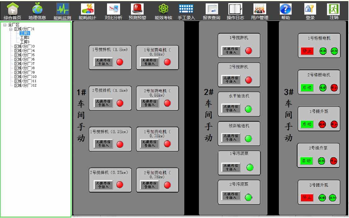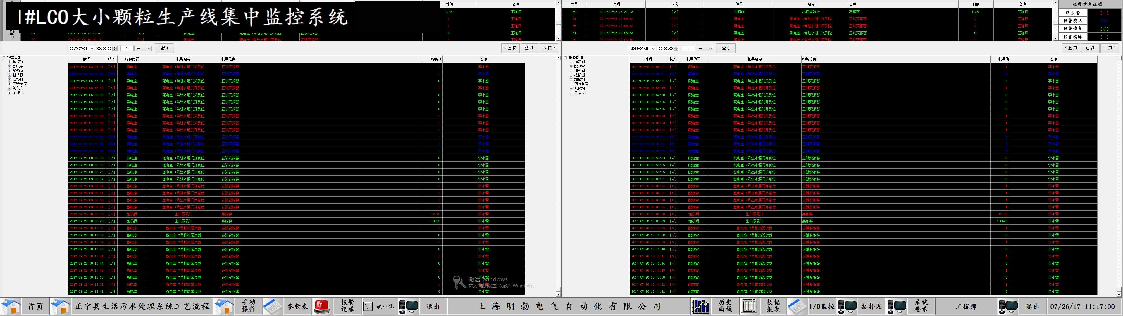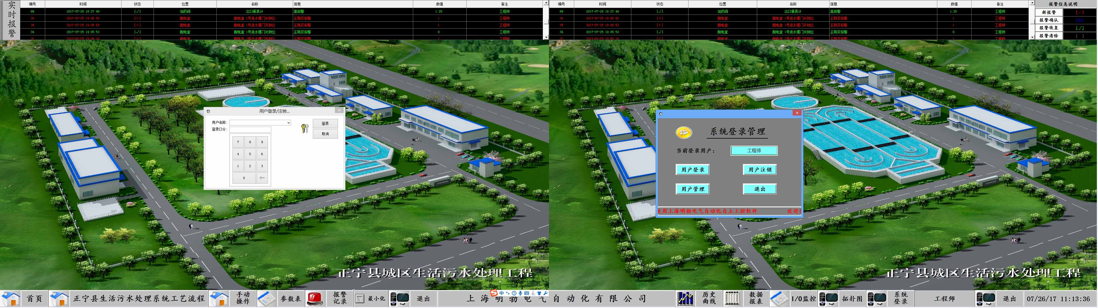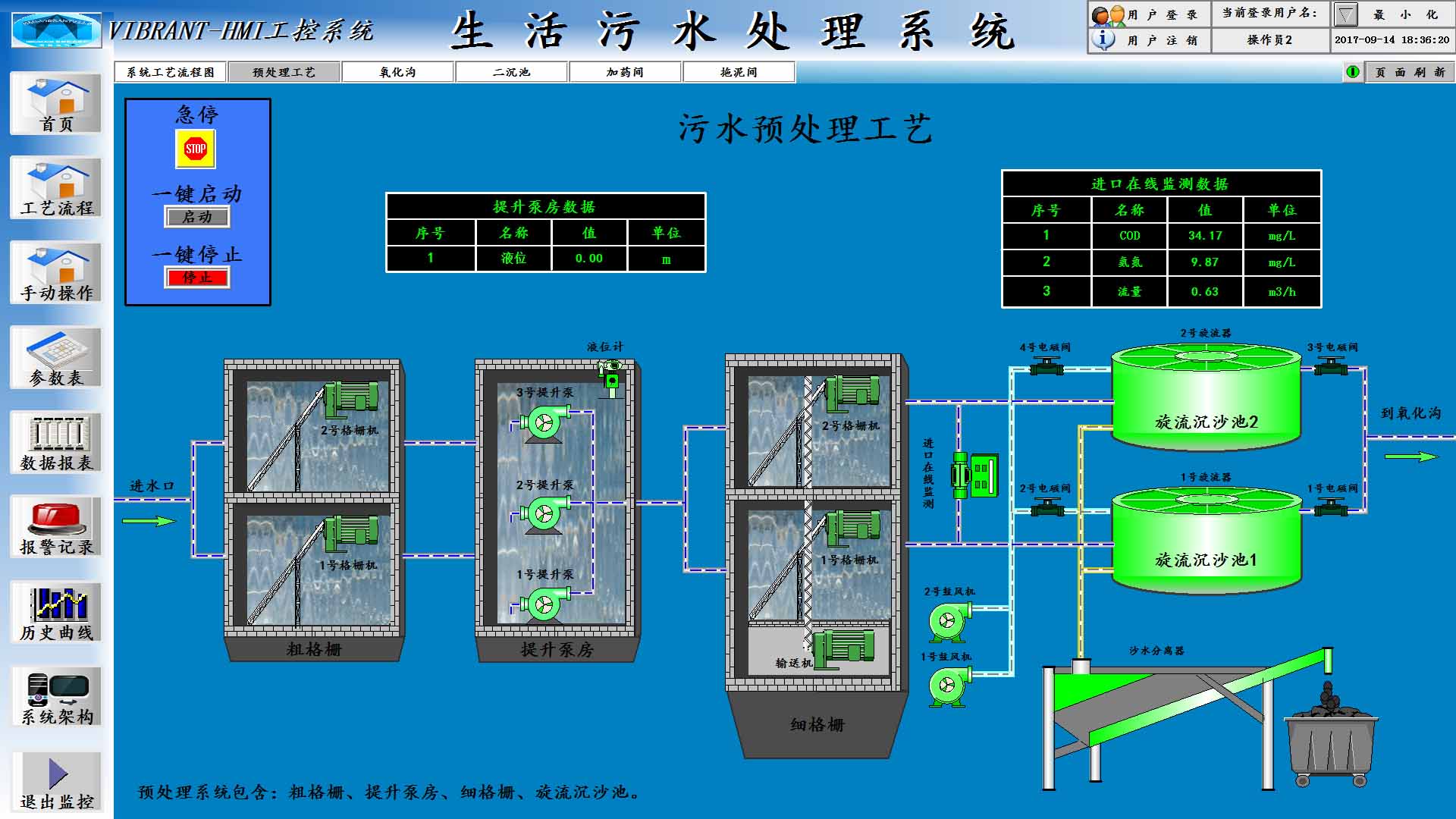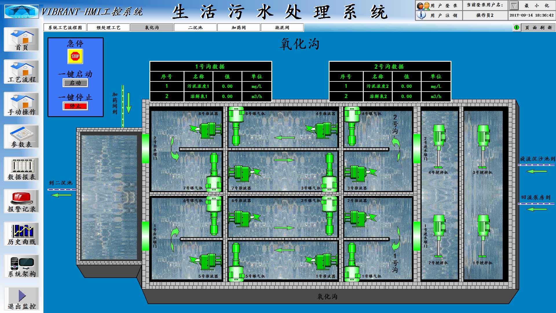该污水处理厂控制系统为典型的SCADA控制系统,由用西门子300中型PLC和VIBRANT-HMI组态软件共同组成。该系统采用双屏扩展显示,可实现对污水处理厂整个厂区所有设备及城区污水管线的实时监控、数据采集、远程控制、故障报警等功能。