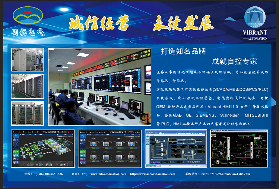 而明勃电气自动化是工业自动化领域的互联采集工厂离散设施控制系统方案专家,提供信息化/自动化(SCADA/MES/DCS/PCS/PLC)控制监控系统集成、工程总包、盘柜设计及成套、、OEM软件产品定制开发(Vibrant-HMI11.0自研)技术服务,AB、GE、SIEMENS、Schneider、 MITSUBISHI等PLC、HMI全系列工控品牌自动化产品销售和技术服务等。