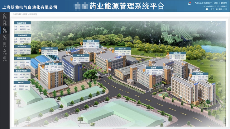远程集中监控系统的工作站人机交互界面为操作者提供了各设备终端的动态参数表、实时/历史趋势图、报警状态栏,以及人机对话的操作界面、参数设定修改界面和参数查询界面等主流和定制型功能画面。如下图所示为厂区全景监测显示,可以实时直观监测厂区内不同区域不同物理位置的能耗。