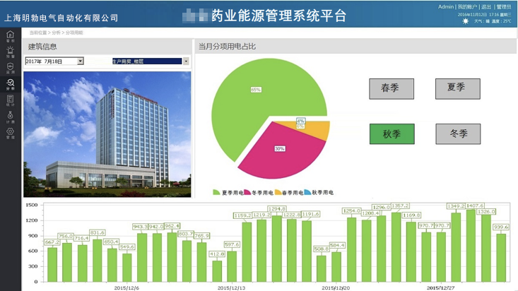 如图所示,主页面显示厂区内的建筑图片,建筑基本信息,建筑分项用电饼图和各种能源的消耗量。根据所选的建筑,对其建筑图片进行加载,可以选择逐日、逐周、逐月来查看当前区域的能耗。根据季节不同,能耗管理的标准也不同,可根据实际情况设定不同季节的能耗标准。