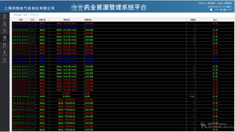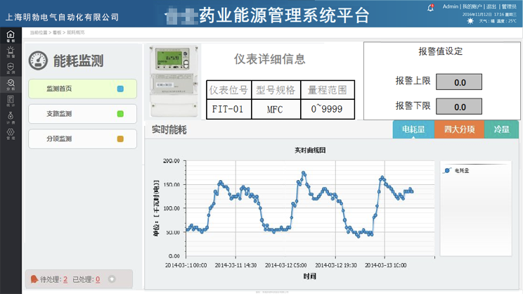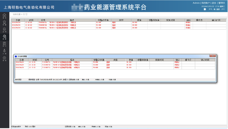 对能源利用状况进行实时记录检测,当数据异常时可自动报警,在上位机控制系统中自动弹出报警画面,及问题处理说明,并提醒管控人员采取应急措施,及时避免/减少能耗浪费。