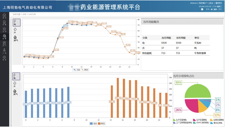 如图所示,在能耗分析界面,电、水、气等各项能耗都会以折线图、柱状图、饼状图来展示,并可自由切换。