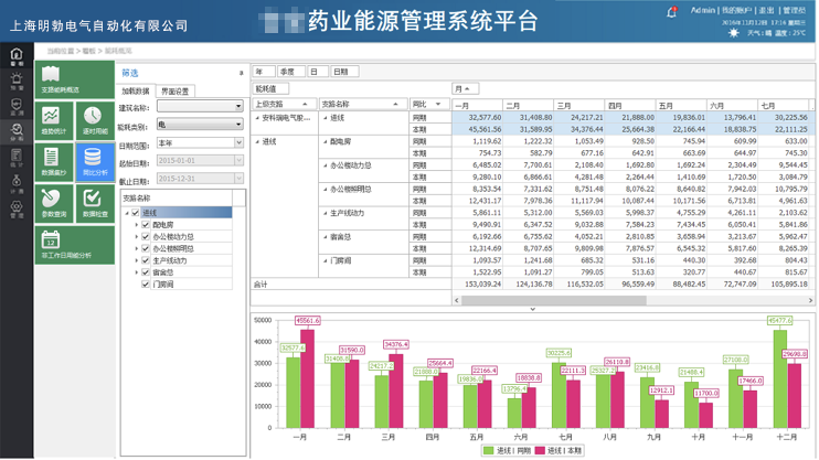 如图所示,可将各种类型(电、水、气)和各主要耗能设备的能耗与去年同期值和上月值进行同比/环比分析,检验节能效果,根据分析结果执行节能绩效考核,工艺/生产计划的分析/调整、以及节能目标的修正。