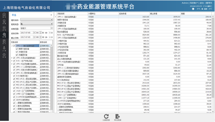 如图所示,在历史文件中选择需要查询的支路,查看分项中各支路用能,也可根据已有的日期或者自定义时间进行查询,也可以选择导出数据或打印。
