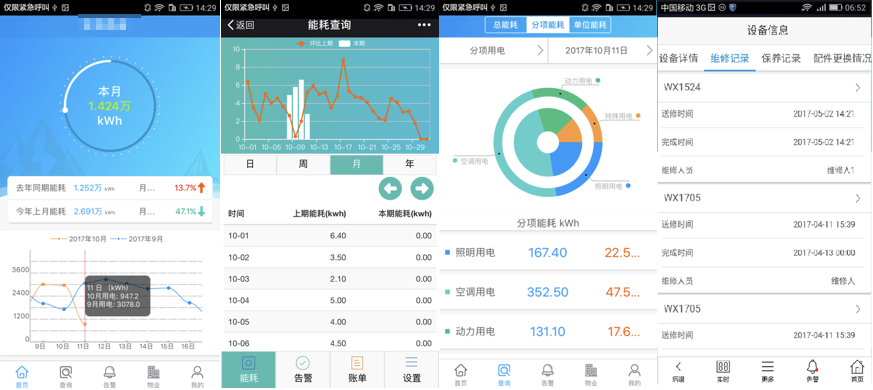 如下图所示,手机端也可实时监测设备能耗,历史曲线,报警记录,设备维护记录等等。系统异常时,APP会实时推送报警信息。